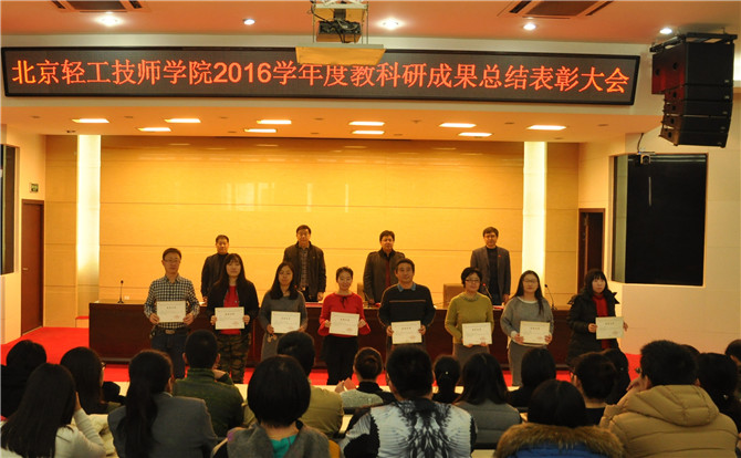 1月18日,学院召开2016年度教科研成果总结表彰大会,表彰本年度在各类教学基本功竞赛中获奖的教师,学院党委书记李茂科、副院长张根岭、党委副书记刘建明、院长助理朱砚如亲临现场,并为获奖选手颁奖。院长助理朱砚如主持会议。本年度全体教师积极参加学院组织的各类教学基本功竞赛活动,积极申报各类科研成果,截止2016年12月底,共获得市级以上科研成果三等奖63项,其中获得中国职协各类成果42项,包括:一等奖4项;二等奖18项;三等奖20项;人社部示范课二等奖1项;获北京市人社局职业能力建设处教科研成果一等奖4项;二等奖3项;三等奖10项。获北京市职教体育协会一等奖1项;二等奖2项。学院向中国职协报送的成果共获得三等奖以上43项;北京市人社局教科研成果奖共17项。陈立、许征获北京职教体协论文等成果奖3项。本学期对各系初评上报的39个教案、36个课件、34篇论文职教所进行了复评,组织校外专家终评,分别评选出一、二、三等奖各18项。