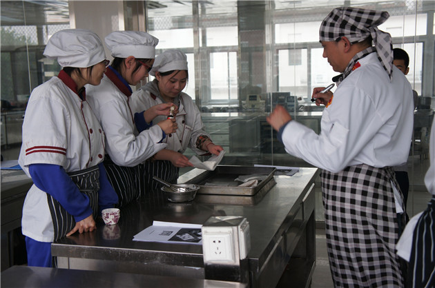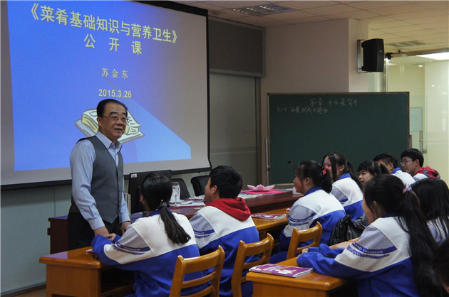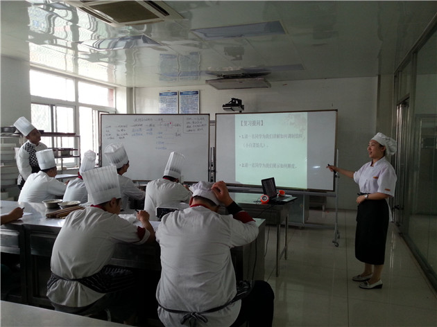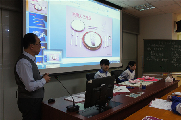 苏金东:身着西式马甲的现代服务教研室主任苏金东老师带头走上了讲台,他带给大家的是一节西餐活动课,从西餐的主要菜式及饮食特点、西餐用餐小常识和西餐摆台及餐具使用等内容。教学设计环节紧凑,采用视频、图片等灵活多样的教学方式,充分体现了师生互动,学生参与的高度热情。