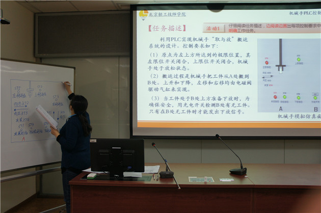 李莉:电工电子教研室李莉老师的授课内容是PLC控制运料小车。教学主要内容是三个小组的学生通过海报形式展示运料小车的设计,从而掌握顺序功能图的设计方法。本节课采用翻转课堂式教学,课程设计新颖,学生参与度高,为提高学生表达能力提供了展示舞台。
