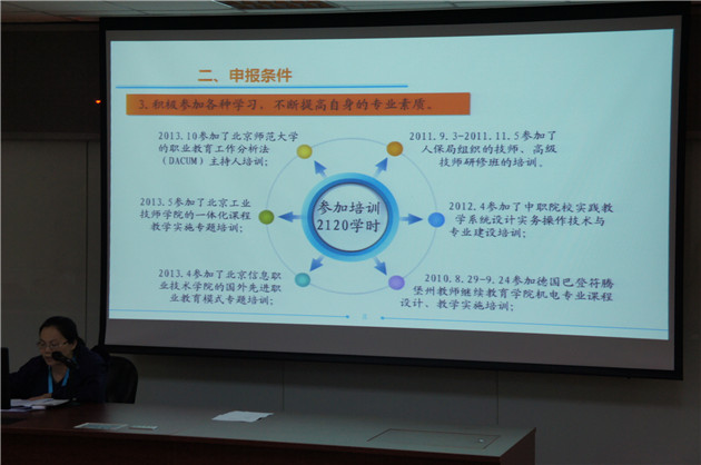 答辩邀请到了北京市教委,北京市劳动局和技工院校的4位专家代表,对答辩教师的PPT陈述进行了现场点评,提出了修改建议,并针对人力资源和社会保障部颁发的《一体化课程开发技术规程》的理解及答辩人的专业知识和教学能力等方面进行了提问,为参加正式答辩理清了思路,明确了重点,达到了预期效果。答辩会由孙玉直副校长主持,职教所全体成员及教务科领导和没课的老师参加了会议。